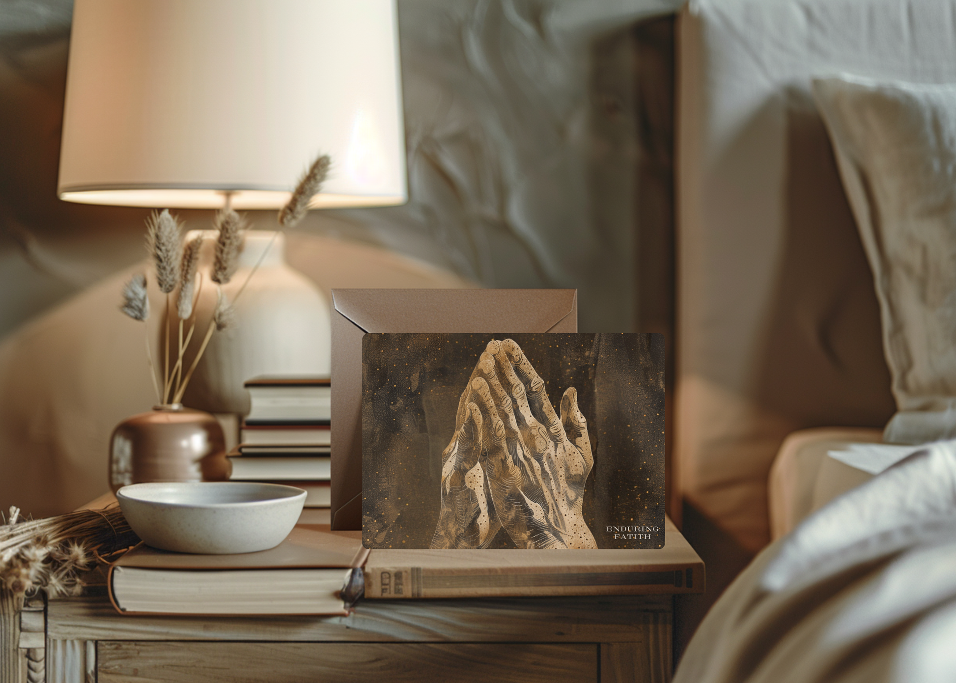 This set includes five flat note cards featuring a contemplative illustration of hands in prayer, rendered in warm earth tones that echo themes of devotion, resilience, and enduring hope.
