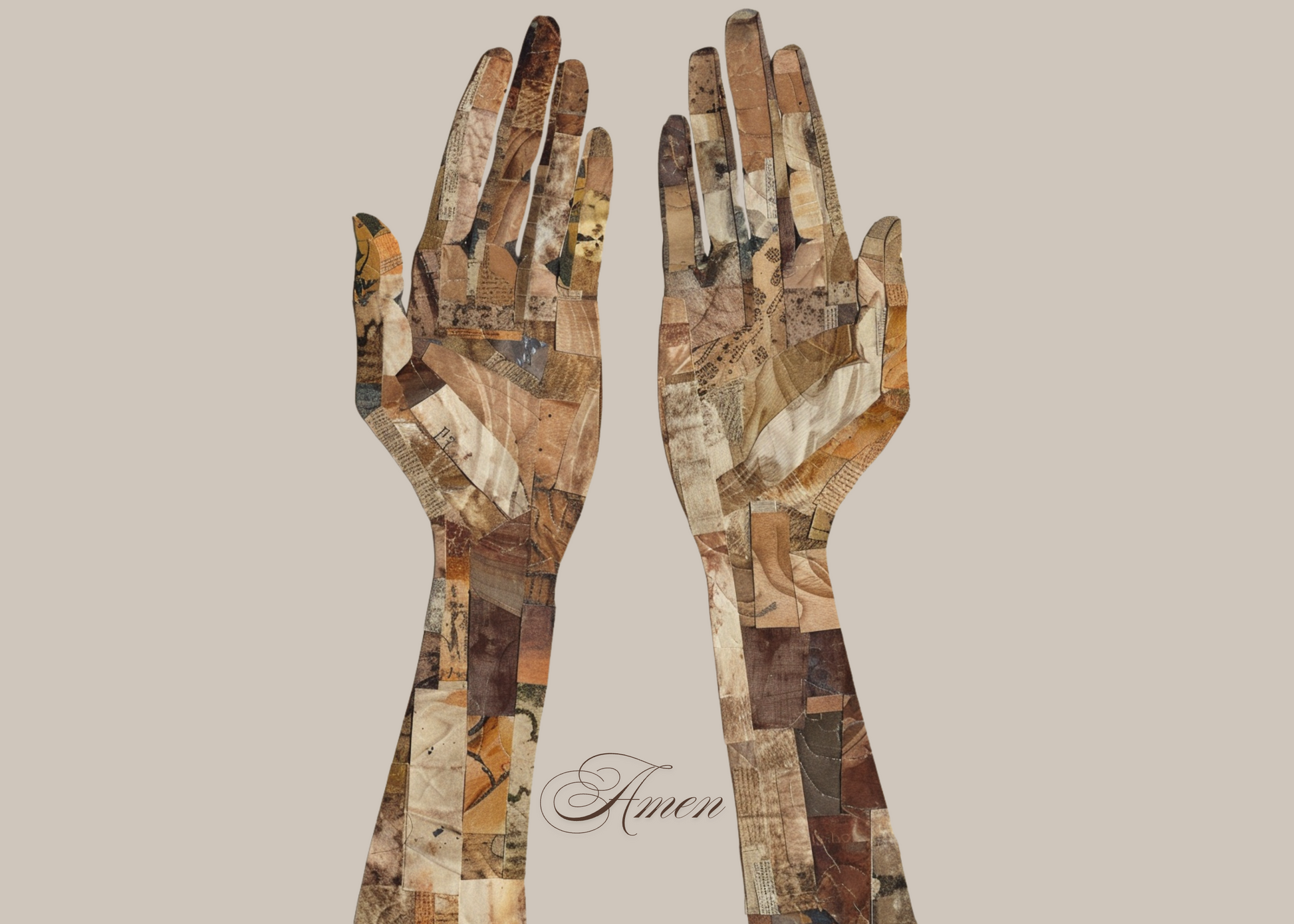 This design features layered collage hands lifted in prayer, composed of warm earth-toned textures that reflect the quiet complexity of faith, compassion, and human connection.